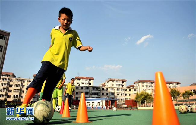 9月5日,在承德市雙橋區(qū)東園林小學,學生在練習帶球。