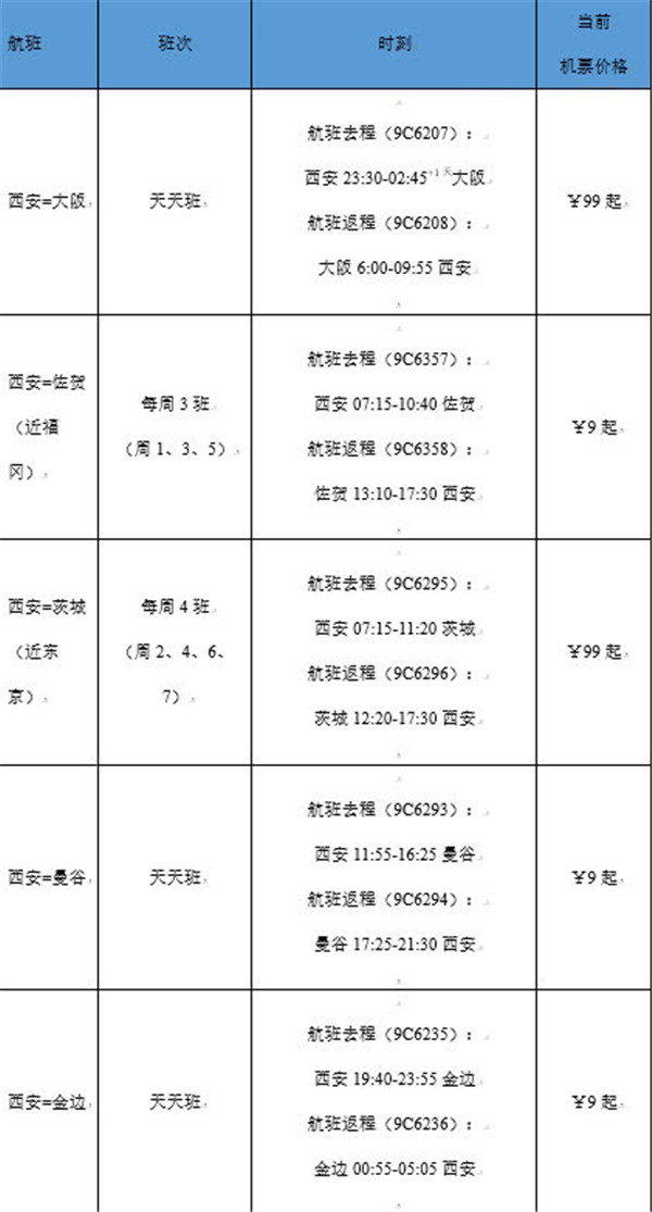 據(jù)了解,此次新開的航線及加密航線,將從2019年10月27日起陸續(xù)開始執(zhí)行,執(zhí)飛機(jī)型為空客A320。開航初期,機(jī)票價格相對優(yōu)惠,從春秋航空官網(wǎng)查詢到的價格來看,西安飛大阪、茨城(近東京)99元起(不含稅),西安飛佐賀(近福岡)、曼谷、金邊低至9元起(不含稅)。