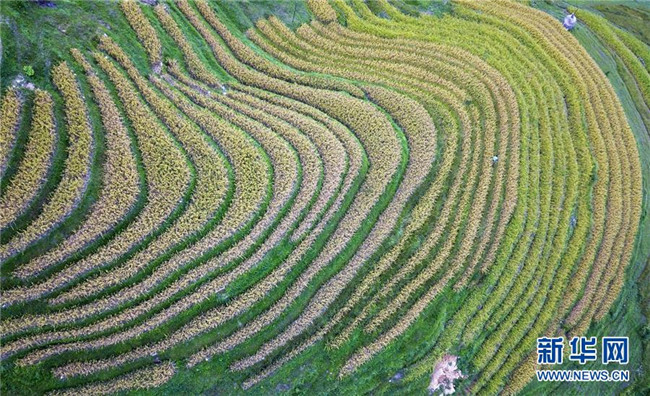 近日,貴州省黔東南苗族侗族自治州榕江縣計(jì)劃鄉(xiāng)計(jì)劃村陽(yáng)開苗寨的水稻陸續(xù)成熟,農(nóng)民們搶抓農(nóng)時(shí)收割稻谷。從空中俯瞰,層層疊疊的梯田線條分明,與古樸的苗寨木樓相互映襯,美不勝收。 新華社記者 楊文斌 攝