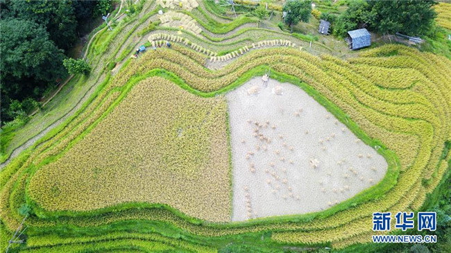 9月17日,貴州省榕江縣計(jì)劃鄉(xiāng)計(jì)劃村陽(yáng)開苗寨的村民在收割稻谷(無(wú)人機(jī)拍攝)。