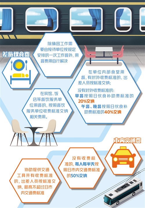 在伙食費方面,按照省級直屬黨政機關和事業(yè)單位差旅費伙食補助100元/人/天的現(xiàn)行標準計算,早午晚三餐應分別按照20元、40元、40元交納費用。按現(xiàn)行交通補助標準,每人每日最高交納80元,每半天交納40元。