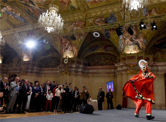 10月9日,在奧地利首都維也納“文化中國、錦繡四川”四川文化旅游展示會上,人們觀看“變臉”表演。