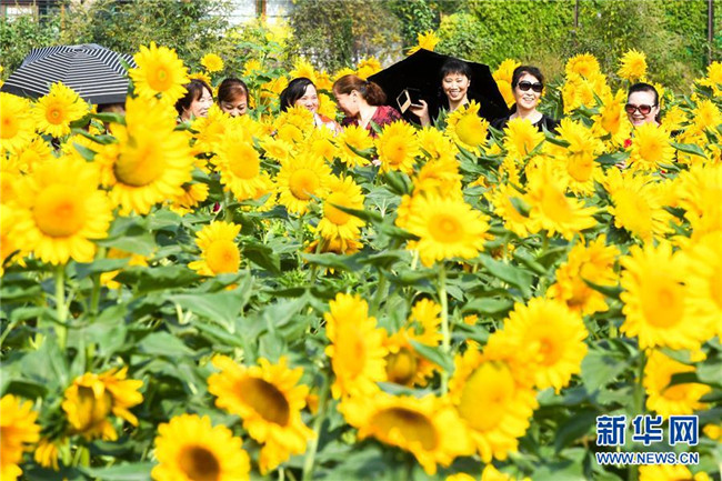 10月10日,游客在湖南省森林植物園的向日葵花海中漫步賞花。新華社記者 陳澤國(guó) 攝