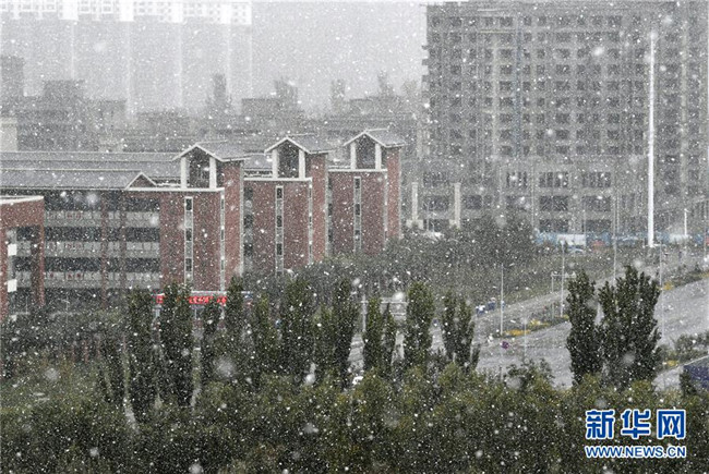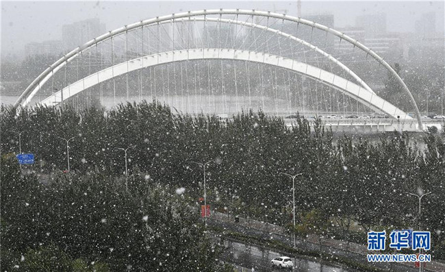 這是在銀川市街頭拍攝的雪景(10月14日攝)。當(dāng)日,寧夏銀川市迎來降雪天氣。寧夏氣象臺發(fā)布暴雪藍色預(yù)警,提醒市民注意交通安全、做好防寒、防滑和清雪工作。新華社記者王鵬攝
