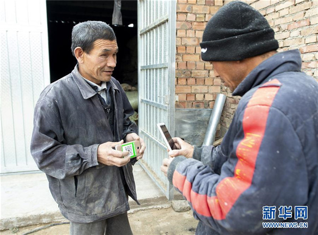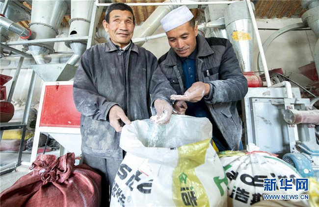 馬騰?。ㄗ螅┱谟枚S碼收取磨面的加工費(10月25日攝)。 新華社發(fā)(楊植森 攝)