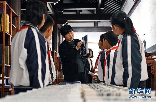 山東省無棣縣無棣希賢學校的小學生在魯北非遺體驗中心了解線裝書的制作工藝(10月30日攝)。