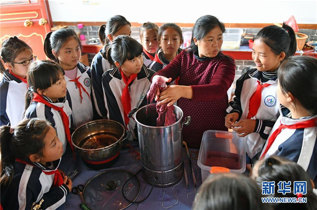 山東省無棣縣無棣希賢學校的小學生在魯北非遺體驗中心體驗草木染色工藝(10月30日攝)。