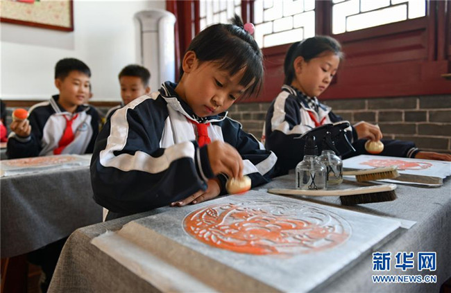 山東省無棣縣無棣希賢學校的小學生在魯北非遺體驗中心體驗拓片工藝(10月30日攝)。
