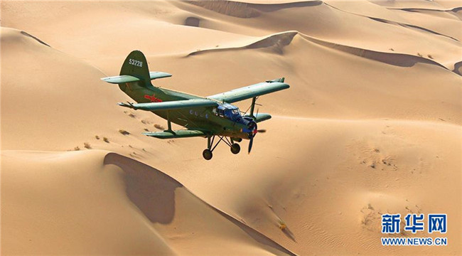 2018年,空軍運-5飛機在沙漠上空進(jìn)行飛播造林作業(yè)。 新華社發(fā)(席博博 攝)