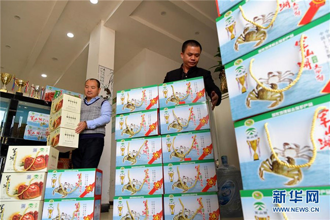 在江西省進(jìn)賢縣軍山湖大閘蟹線上銷售網(wǎng)點,工作人員準(zhǔn)備將裝箱的大閘蟹發(fā)貨給網(wǎng)購的顧客(2018年11月9日攝)。新華社記者 彭昭之 攝
