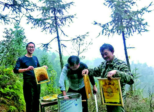 ▲鄧文慧(左一)幫貧困戶(hù)收蜂蜜。
