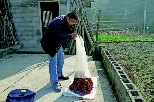 楊運(yùn)大到貧困戶(hù)家里走訪,幫助曬辣椒。