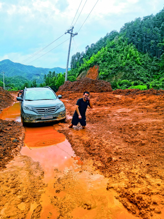 ▲瑤山突發(fā)泥石流,付昭成步行前往貧困戶(hù)家走訪。