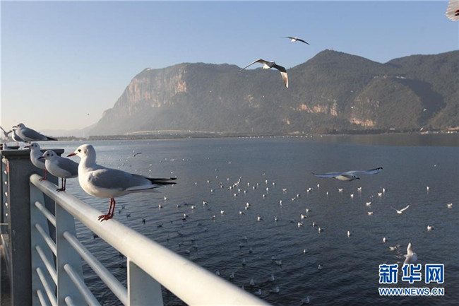 11月17日,紅嘴鷗在滇池附近棲息。 新華社記者 金林鵬 攝