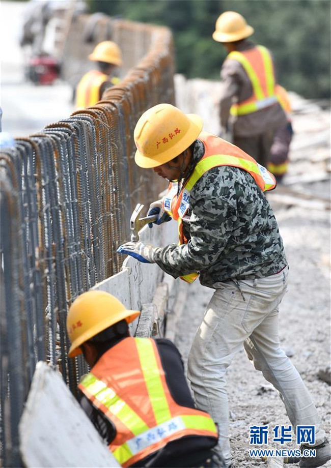 11月19日,在廣西融水苗族自治縣四榮鄉(xiāng),工人在羅融二級公路建設(shè)現(xiàn)場施工。新華社記者 黃孝邦 攝