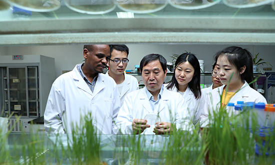 西北農(nóng)林科技大學(xué)旱區(qū)作物逆境生物學(xué)國(guó)家重點(diǎn)實(shí)驗(yàn)室小麥-條銹菌互作室里,“小麥癌癥”攻克者康振生院士正指導(dǎo)學(xué)生觀察酵母菌落培養(yǎng)情況。張勁松攝