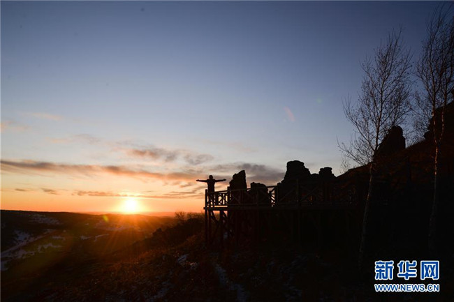 這是11月25日拍攝的克什克騰石陣景區(qū),一名游客張開雙臂面向夕陽。