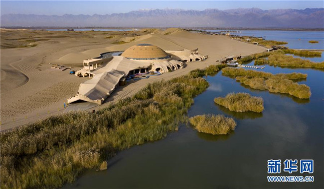 位于寧夏石嘴山市平羅縣境內(nèi)的沙湖景區(qū),依沙傍水呈現(xiàn)出獨(dú)特的魅力(10月30日無人機(jī)拍攝)。 新華社記者 馮開華 攝