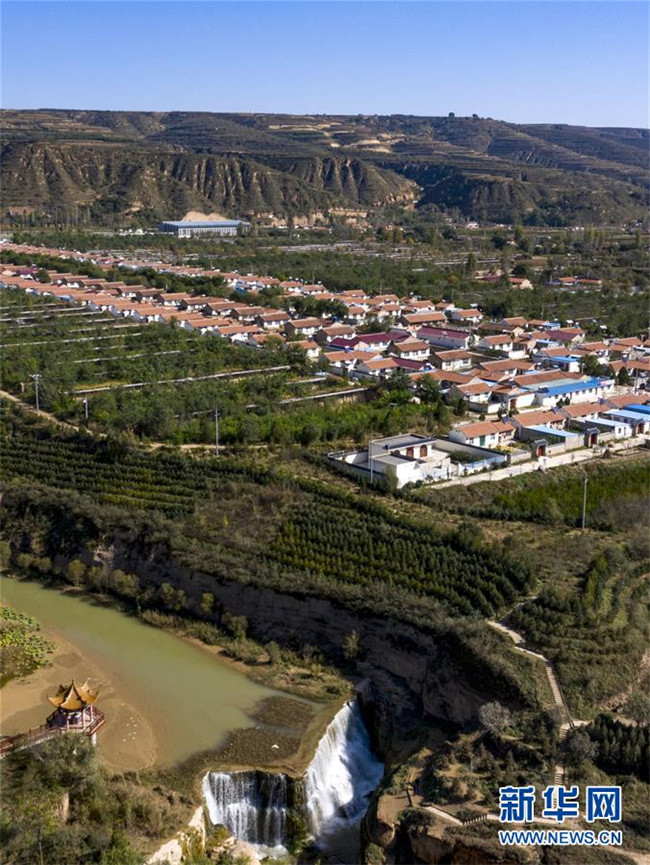 流經(jīng)寧夏固原市彭陽縣城陽鄉(xiāng)的茹河,因地殼變化和河床運(yùn)動形成旱塬上的瀑布,當(dāng)?shù)匾源税l(fā)展鄉(xiāng)村旅游(10月12日無人機(jī)拍攝)。 新華社記者 馮開華 攝