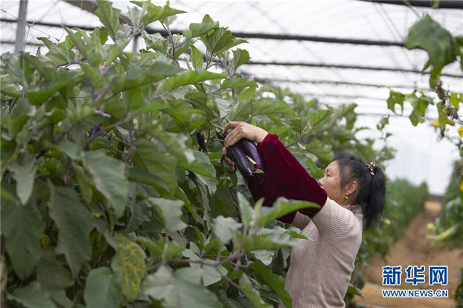 12月18日,在于都縣禾豐鎮(zhèn)一家富硒蔬菜種植基地,農(nóng)民在采摘富硒茄子。新華社記者 張浩波 攝