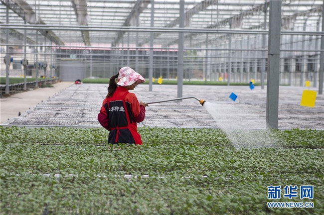 12月18日,在于都縣禾豐鎮(zhèn)一家富硒蔬菜種植基地,農(nóng)民在給蔬菜幼苗澆水。新華社記者 張浩波 攝