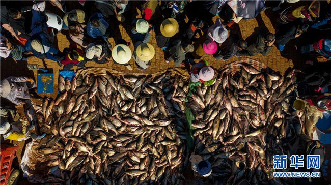 12月25日,人們?cè)谛窃坪系睦虾泳佐~市選購(gòu)剛捕撈的鮮魚(無(wú)人機(jī)拍攝)。新華社記者 胡超 攝