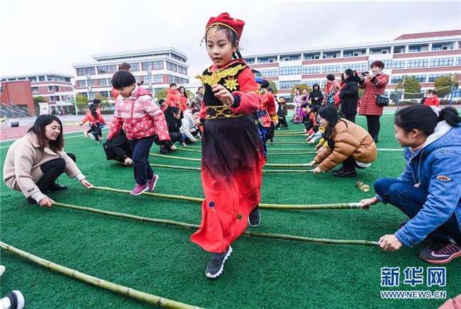 12月26日,身著少數(shù)民族服裝的孩子與同學(xué)們一起體驗竹竿舞趣味活動。當日,浙江省長興縣李家巷鎮(zhèn)中心幼兒園舉辦“炫彩民族風歡樂來運動”為主題的趣味民族游戲活動。該幼兒園有一些孩子來自壯族、苗族、布依族等少數(shù)民族。幼兒園旨在通過這種活動,讓孩子們和家長共同體驗竹竿舞、篝火舞、擲糠包等少數(shù)民族特色游戲,了解少數(shù)民族特色文化。新華社記者徐昱攝