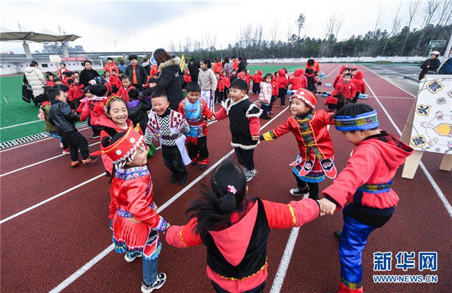 12月26日,身著少數(shù)民族服裝的孩子與同學(xué)們一起參加篝火舞活動。當日,浙江省長興縣李家巷鎮(zhèn)中心幼兒園舉辦“炫彩民族風歡樂來運動”為主題的趣味民族游戲活動。該幼兒園有一些孩子來自壯族、苗族、布依族等少數(shù)民族。幼兒園旨在通過這種活動,讓孩子們和家長共同體驗竹竿舞、篝火舞、擲糠包等少數(shù)民族特色游戲,了解少數(shù)民族特色文化。新華社記者徐昱攝