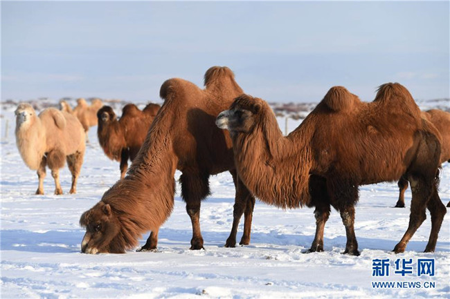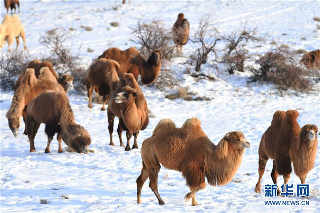 12月30日,一群駱駝在新疆吉木乃縣“萬(wàn)駝園”覓食。新華社記者 沙達(dá)提 攝