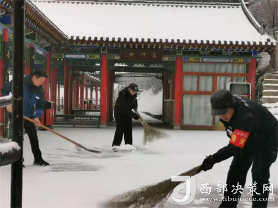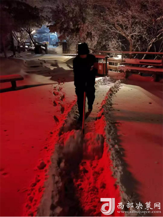 此次降雪持續(xù)時間長,降雪量大,清掃過程以主要道路為重點,快速對路面積雪進(jìn)行清掃,確保天亮后游客能夠安全游覽景區(qū)。