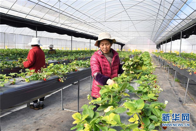 1月9日,云南省富民縣散旦鎮(zhèn)漢營村農(nóng)民在草莓種植基地剪枝。 新華社記者楊宗友攝