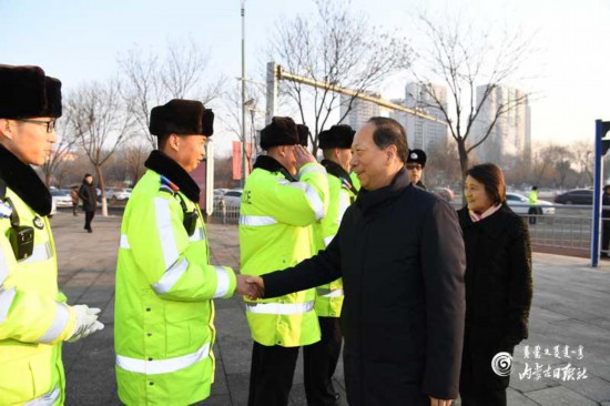 1月24日,自治區(qū)黨委書(shū)記、人大常委會(huì)主任石泰峰,自治區(qū)黨委副書(shū)記、自治區(qū)主席布小林在呼和浩特看望慰問(wèn)春節(jié)期間堅(jiān)守一線崗位的執(zhí)勤交警。 內(nèi)蒙古日?qǐng)?bào)社融媒體記者 袁永紅 攝