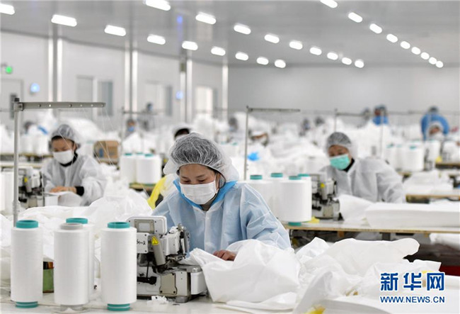 在位于湖北省仙桃市的湖北裕民防護(hù)用品有限公司生產(chǎn)車(chē)間內(nèi),工人們加緊生產(chǎn)醫(yī)用防護(hù)用品(1月28日攝)。新華社記者 李賀 攝