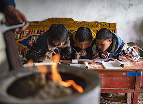 扎西卓瑪在寄宿制學校上學,在校時總是很早就起床背誦課文,可在家就需要靠自覺了。