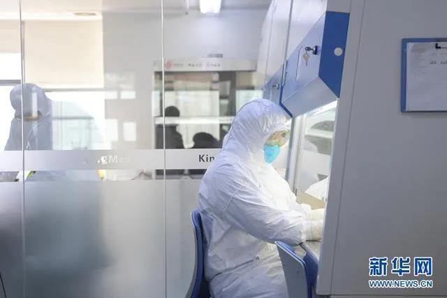 ▲實驗室檢驗人員在生物安全柜里面操作,對核酸樣本進行提取。圖片來源:新華網(wǎng)
