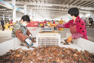 走進湖北潛江小龍蝦交易中心,眼前一派忙碌景象。500多家水產(chǎn)商戶已經(jīng)復工,工人們忙著分揀包裝,成箱的小龍蝦被裝上物流車輛,運往全國各地。