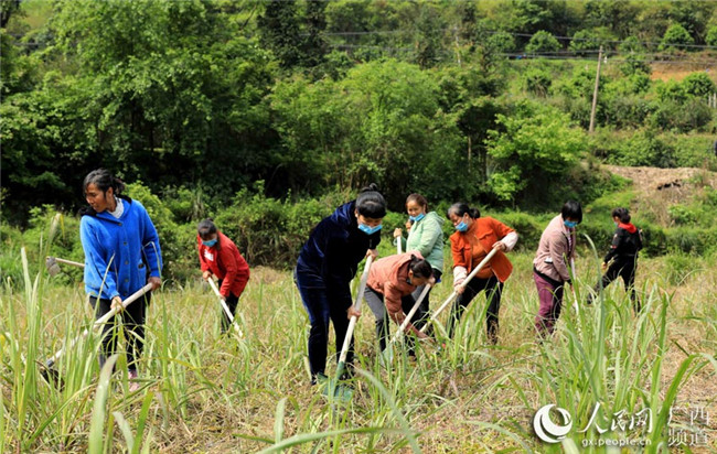 在廣西柳州市融安縣沙子鄉(xiāng)紅妙村,勞務隊成員在村集體經(jīng)濟甘蔗示范點勞作。譚凱興攝