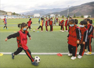 4月27日,在四川省涼山彝族自治州普格縣螺髻山鐵道兵希望學(xué)校的操場上,小球員在老師的指導(dǎo)下踢球。瀘州市龍馬潭區(qū)對口幫扶普格縣前方指揮部于2019年3月探索體育扶貧,在螺髻山鐵道兵希望學(xué)校組建了足球隊,從幫扶干部中選派體育教師,利用業(yè)余時間指導(dǎo)球隊訓(xùn)練。男隊去年參加了涼山州青少年校園足球聯(lián)賽,并打進(jìn)了男子組八強(qiáng)。王明峰 何海洋攝影報道
