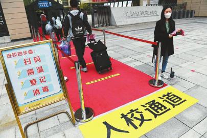 成都教科院附中高一年級(jí)學(xué)生返校時(shí),學(xué)生統(tǒng)一在指示標(biāo)牌的指引下,依次經(jīng)過“1米靜候區(qū)”“紅外體溫監(jiān)測(cè)儀測(cè)溫區(qū)”,同時(shí)檢查學(xué)生的健康碼、對(duì)行李等物品進(jìn)行消毒,學(xué)校的“教師黨員服務(wù)隊(duì)”為住宿學(xué)生搬運(yùn)行李等隨身物品。每班班主任收取《健康申報(bào)卡》《14日體溫監(jiān)測(cè)表》《家長(zhǎng)承諾書》以及《學(xué)生承諾書》。飯點(diǎn)時(shí)間,學(xué)生在班主任帶領(lǐng)下沿指定行徑路線錯(cuò)峰到食堂就餐,食堂設(shè)置了“單循環(huán)”的用餐路線,避免學(xué)生交叉聚集。為迎接復(fù)課,每位班主任都準(zhǔn)備了額溫槍、學(xué)生體溫監(jiān)測(cè)臺(tái)賬、因病缺課不能到校學(xué)生臺(tái)賬、免洗手消毒凝膠、醫(yī)用消毒酒精等“防疫五件套”。(四川日?qǐng)?bào)記者 李向雨 攝影報(bào)道)