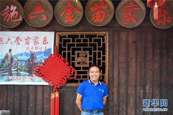 這是施六金在他的農(nóng)家樂前留影(4月25日攝)。1973年出生于十八洞村的施六金,由于父親患病很早就放棄學業(yè)和母親扛起了家庭的重擔。為了生活,他還曾遠去東南亞打工。2015年,看到家鄉(xiāng)的變化,施六金回到村里開起了農(nóng)家樂,年度家庭人均純收入也從2014年的1715元增長到了2019年的35696元。2018年,施六金與心愛的人組建了家庭。今年初,施六金與愛人迎來了一個大胖小子。“做人做事要懂得回報和感恩。”施六金給剛出生的兒子取名施澤恩。新華社記者薛宇舸攝