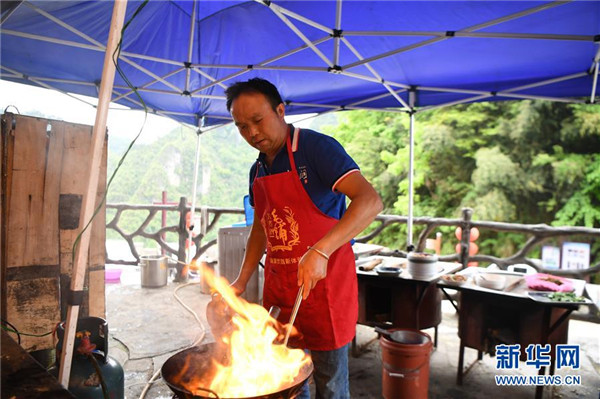 施六金在自家開的農(nóng)家樂為客人準備午餐(4月25日攝)。1973年出生于十八洞村的施六金,由于父親患病很早就放棄學業(yè)和母親扛起了家庭的重擔。為了生活,他還曾遠去東南亞打工。2015年,看到家鄉(xiāng)的變化,施六金回到村里開起了農(nóng)家樂,年度家庭人均純收入也從2014年的1715元增長到了2019年的35696元。2018年,施六金與心愛的人組建了家庭。今年初,施六金與愛人迎來了一個大胖小子。“做人做事要懂得回報和感恩。”施六金給剛出生的兒子取名施澤恩。新華社記者薛宇舸攝