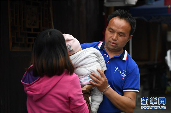 施六金(右)從妻子手中接過兒子施澤恩(4月25日攝)。1973年出生于十八洞村的施六金,由于父親患病很早就放棄學業(yè)和母親扛起了家庭的重擔。為了生活,他還曾遠去東南亞打工。2015年,看到家鄉(xiāng)的變化,施六金回到村里開起了農(nóng)家樂,年度家庭人均純收入也從2014年的1715元增長到了2019年的35696元。2018年,施六金與心愛的人組建了家庭。今年初,施六金與愛人迎來了一個大胖小子。“做人做事要懂得回報和感恩。”施六金給剛出生的兒子取名施澤恩。新華社記者薛宇舸攝