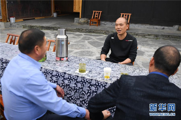 楊正邦(右)在為來自浙江的住客介紹十八洞村種植的“黃金茶”(4月25日攝)。楊正邦1978年出生于十八洞村,在外打工多年。近些年,眼看來十八洞村的游客越來越多,村里越來越熱鬧,楊正邦在2017年結束自己的打工生涯回鄉(xiāng)發(fā)展。他先是在村里擺起小吃攤,2018年開起農(nóng)家樂,去年又搭起新房子擴建成民宿,年度家庭人均純收入從2014年的1923元增加到2019年的7173元。新華社記者薛宇舸攝