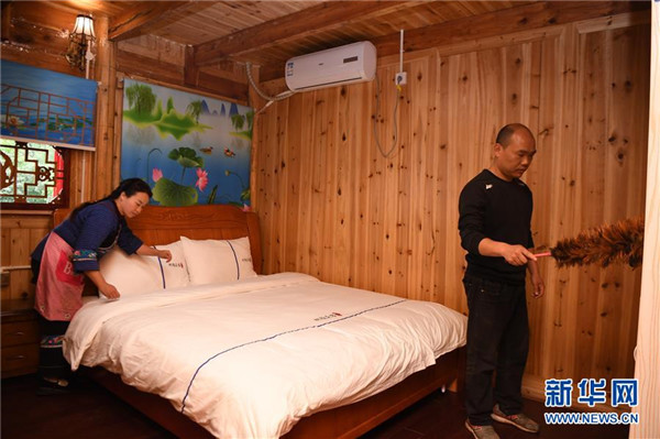 楊正邦(右)和妻子施蘭珍一起打掃民宿房間(4月25日攝)。楊正邦1978年出生于十八洞村,在外打工多年。近些年,眼看來十八洞村的游客越來越多,村里越來越熱鬧,楊正邦在2017年結束自己的打工生涯回鄉(xiāng)發(fā)展。他先是在村里擺起小吃攤,2018年開起農(nóng)家樂,去年又搭起新房子擴建成民宿,年度家庭人均純收入從2014年的1923元增加到2019年的7173元。新華社記者薛宇舸攝