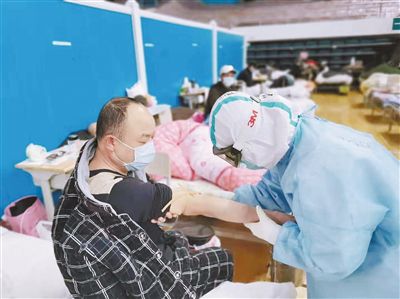 對于護理醫(yī)療隊的隊員們來說,在洪山體育館武昌方艙醫(yī)院的每一天,都是那么緊張。護理人員需快速對新入院的患者實施入院流程管理,觀察病情、監(jiān)測病人生命體征,及時將不適合入院的患者分診出轉(zhuǎn)至定點醫(yī)院;在為患者做好血氧監(jiān)測、體溫監(jiān)測等??谱o理的同時,還包攬了喂飯、喂藥、翻身、擦洗、換衣、大小便管理等各種貼身護理工作。這些看起來簡單的工作,卻因為要在防護服、口罩、護目鏡等防護裝備的層層包裹下進行,變得異常吃力。最忙的時候,3個護士要同時護理82名患者,但隊員們憑著自身過硬的護理經(jīng)驗,攻克了一個又一個難關(guān)。