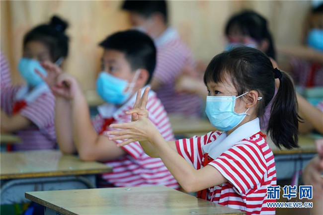 5月13日,廣西桂林市龍勝各族自治縣龍勝小學二年級的學生在“開學第一課”上學習洗手消毒方法。新華社發(fā)(黃勇丹 攝)