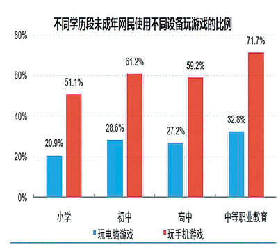 除了學(xué)習(xí)之外,網(wǎng)絡(luò)已經(jīng)成為未成年人娛樂和社交的重要工具?!秷?bào)告》顯示,聽音樂和玩游戲繼續(xù)是目前未成年網(wǎng)民的主要網(wǎng)上娛樂活動,分別為65.9%和61.0%。前者作為未成年人的娛樂方式為家長、學(xué)校等各方所接受,但是后者引起很多爭議。近年來,網(wǎng)絡(luò)游戲行業(yè)發(fā)展迅速,伴隨智能手機(jī)的普及,向未成年群體的滲透更加快速。調(diào)查顯示,61.0%的未成年網(wǎng)民會經(jīng)常在網(wǎng)上玩游戲,手機(jī)是未成年人上網(wǎng)玩游戲的主要設(shè)備。小學(xué)生網(wǎng)民玩手機(jī)游戲的比例超過一半;初中和高中生網(wǎng)民玩手游的比例分別為61.2%和59.2%;中職學(xué)生網(wǎng)民達(dá)到71.7%。短視頻是近幾年蓬勃興起的互聯(lián)網(wǎng)娛樂服務(wù)。2019年未成年網(wǎng)民在互聯(lián)網(wǎng)上經(jīng)常收看短視頻的比例達(dá)到46.2%,較2018年的40.5%提升5.7個(gè)百分點(diǎn)。