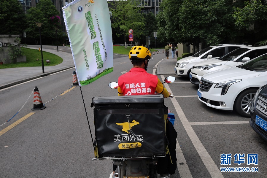 “您好,我是重慶市快遞、外賣騎手禁毒宣傳志愿者,您點(diǎn)的外賣到了。”配送時(shí),周歡把外賣和禁毒宣傳品一同遞交給了顧客,并向她介紹了禁毒知識。新華網(wǎng)發(fā) (滕華 攝)