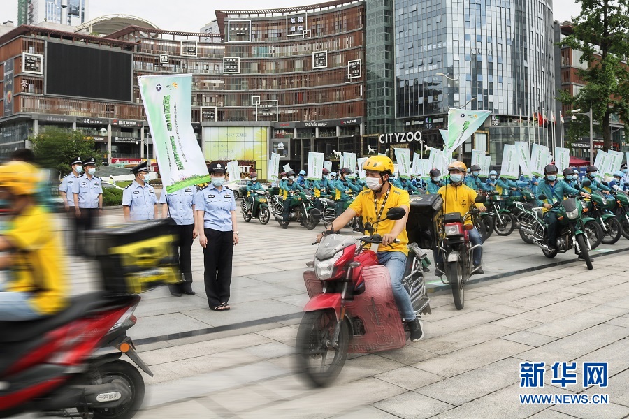 重慶市快遞、外賣騎手禁毒宣傳志愿者小分隊(duì)成立。新華網(wǎng)發(fā) (滕華 攝)
