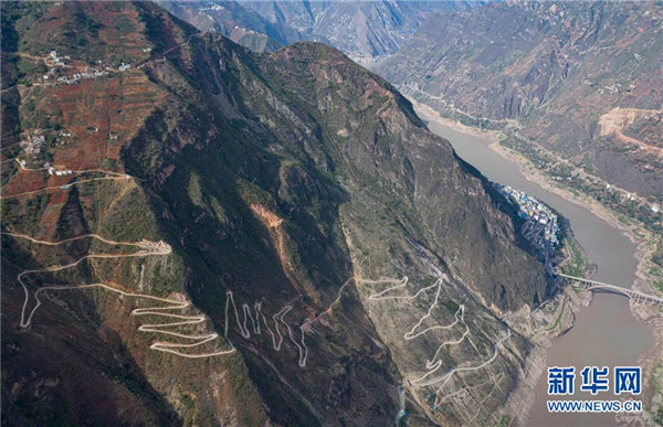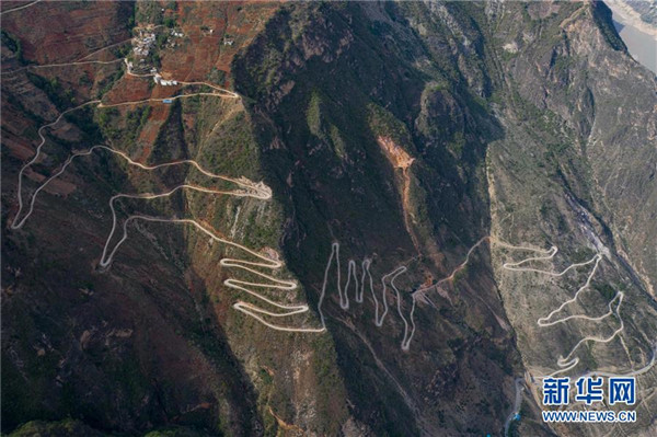金陽縣蘆稿鎮(zhèn)大灣子村12公里左右的通村公路,28個(gè)彎蜿蜒盤旋在金沙江峽谷懸崖絕壁邊(6月7日攝,無人機(jī)照片)。坐落在金沙江畔的四川省金陽縣是國家級(jí)深度貧困縣,境內(nèi)群山連綿起伏,海拔落差大,眾多村寨處于高山或者高半山上,道路施工難度大。近年來,當(dāng)?shù)卣畬⒔煌ㄗ鳛槊撠毠?jiān)的先導(dǎo)性工程,路越修越寬、越修越好,成為當(dāng)?shù)厝罕姷拿撠氈赂宦?。截?019年底,金陽縣實(shí)現(xiàn)所有鄉(xiāng)鎮(zhèn)通油路、建制村通硬化路,鄉(xiāng)道里程達(dá)329.9公里,村道里程達(dá)866.8公里。新華社記者江宏景攝